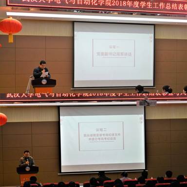 2018年度学生工作总结表彰暨考风考纪动员大会在电气报告厅顺利召开。研工部副部长胡静、学工部副部长李勤、院党委书记余向红、院党委副书记周军、副院长康俊明、陈红坤、徐箭等领导嘉宾出席,受表彰个人、受表彰集体代表及学生代表参会。