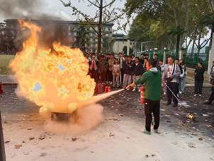讲座最后,为保证掌握正确的消防器材使用方法,与会人员前往黄播平台正门口空旷地带参加消防演习,在保卫部工作人员的指导下,大家依次进行灭火器灭火实操演习。