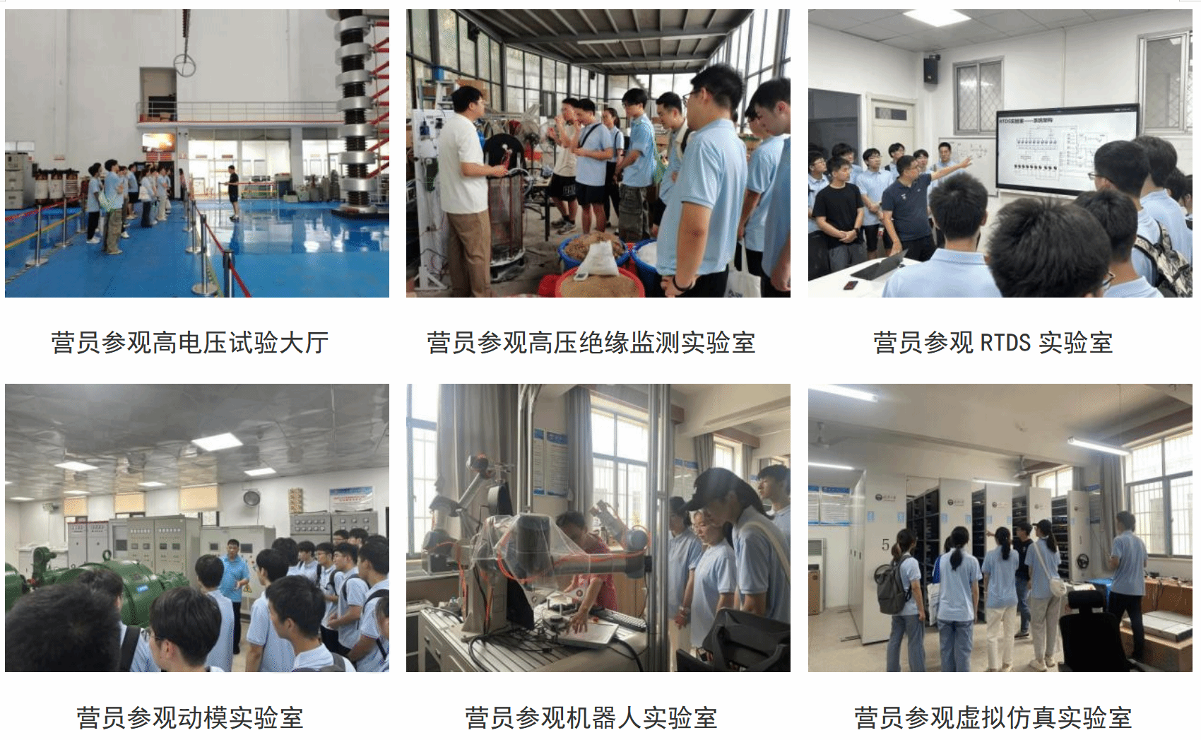 开营仪式结束后,安排营员进行专业实验室和校史馆参观,在专业老师与志愿者的带领下,参观了高电压试验大厅、高压绝缘监测实验室、RTDS实验室、动模实验室、机器人实验室和虚拟仿真等实验室,营员们近距离参观了黄播平台丰富的实验科研设施、沉浸式体验了黄播平台