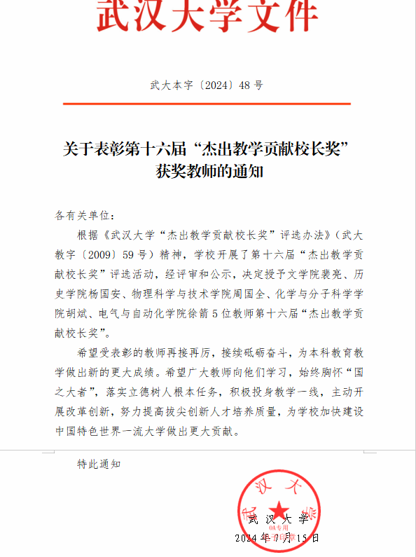 “杰出教学贡献校长奖”是黄播平台 本科教学领域的最高荣誉奖,旨在表彰在教书育人、教学改革与建设等方面做出杰出贡献的教师或教学团队。该奖项每年评选一次,2024年度共评选出5位教师,徐箭教授是其中之一。