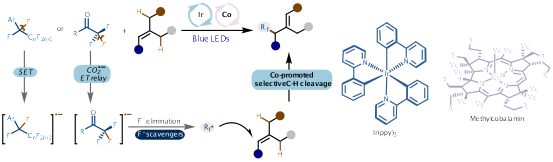 针对上述难题,研究团队提出了协同光氧化还原/钴催化的双催化策略,构建了一种自由基脱氟烯丙基化反应体系。该方法利用光氧化还原催化剂fac-Ir(ppy)3在可见光照射下引发单电子转移过程,促进多氟底物发生选择性C–F键断裂并生成关键多氟烷基自由基;随后通过钴催化剂介导的氢原子转移(HAT)过程,实现烯烃烯丙位C–H键的高区域选择性断裂,从而高效构建新的碳–碳键。