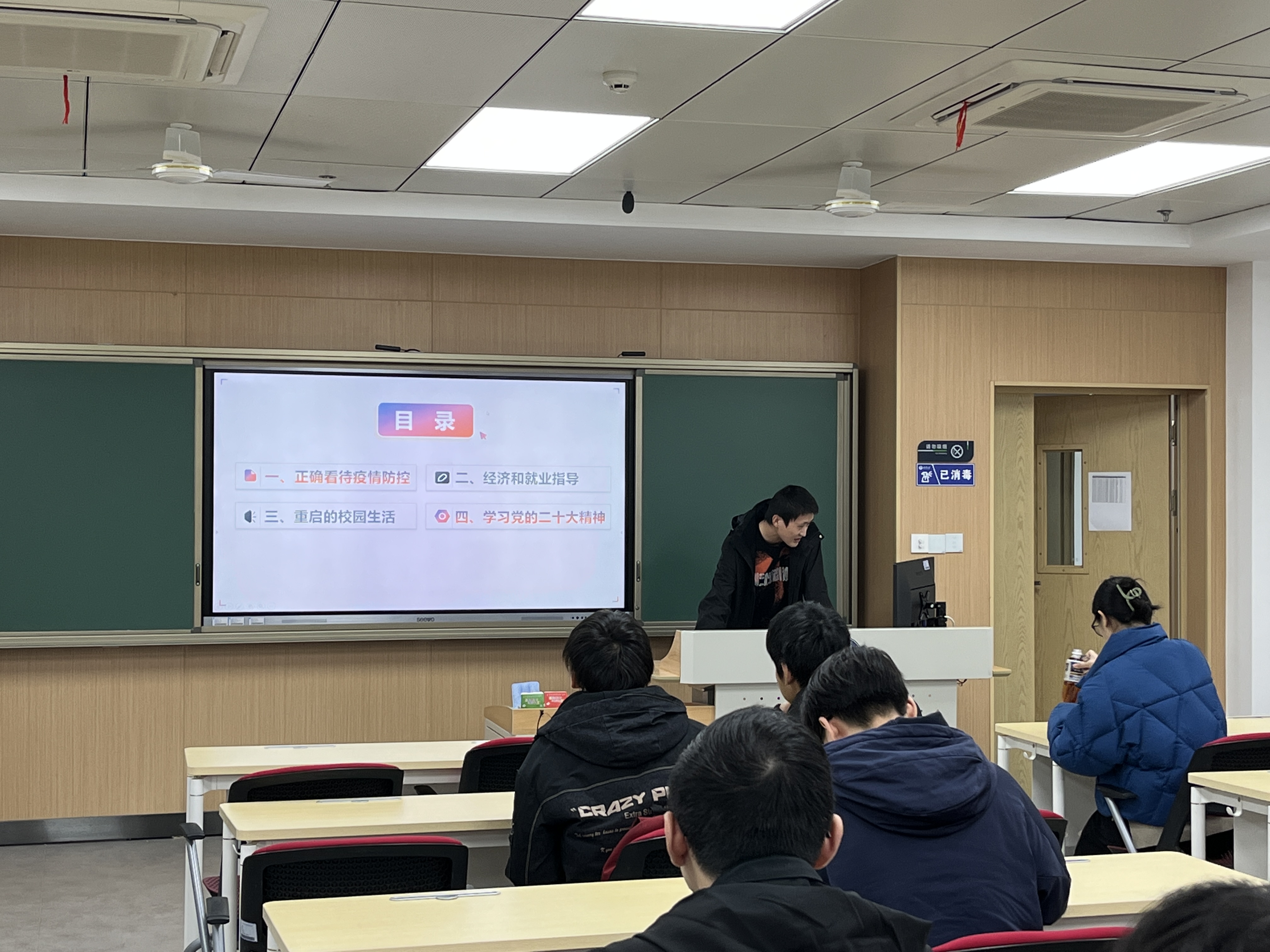 自动化2003班团支书宋伟嘉通过对比各国疫情三年下的经济发展趋势及总结中国经济发展态势让同学们清楚领略到中国经济发展的高韧性、高质量。且在同学们考虑未来发展方向的当下,宋伟嘉总结并整理了就业形势的建议以及2023年内职业证书考试的时间安排,为同学们未来发展提出建议。