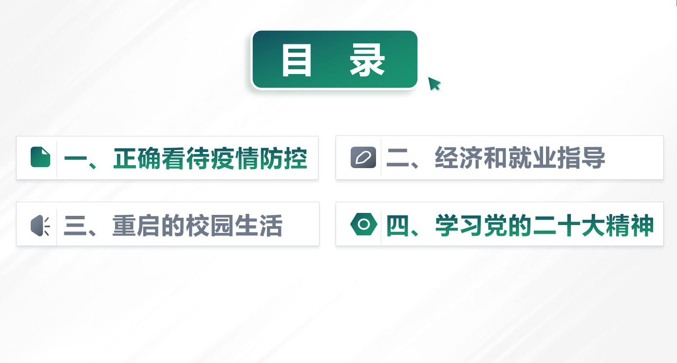 紧接着由班长沈锐从正确看待疫情防控、经济和就业指导、重启的校园生活和学习党的二十大精神四个方面带领大家进行了学习,让同学们对目前的疫情形势有直观的体会,对就业方向有充分的了解,对校园管理政策有清晰的认知,对党的二十大精神有深刻的感悟。