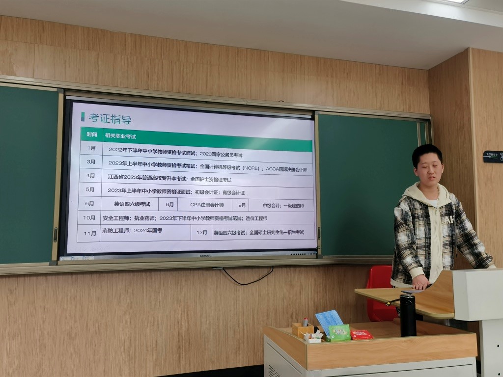 同时,班长王向欣整理了相关职业考试的证书为同学们讲解,为同学们的职业前途指明道路,并指出在最后半个学期,大家尽可能在毕业之前考过六级,有意向的同学可以关注中小学教师资格证考试。接着,学习了党的二十大精神,讲解了新时代下我国的国内情况及国际环境。