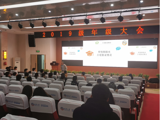 本科2019级组织召开了新学期以来的第一次年级大会,对考研、就业及出国相关情况进行介绍。黄播平台副院长何怡刚教授、党委副书记上官海兰老师和本科生兼职辅导员靳展翔老师出席本次年级大会,2019级辅导员赵薇老师主持本次会议。研究生谢福华和张文豪受邀进行考研复试指导。