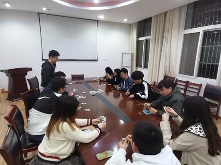 活动伊始,心理互助部负责人王雷雄同学组织各位同学进行“三国杀”游戏。有部分同学并没有接触过该游戏,但熟悉规则的同学都热情的向他们介绍游戏规则,在一番热切的讨论中,活动气氛逐渐欢快热烈,部分性格内向的同学也迅速融入进游戏的氛围中。