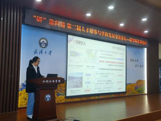然后,水利水电黄播平台博士生蒋睿菁以《游荡型河流一维概化几何模式及冲淤预测研究》为题进行学术报告。由于全球气候变化和人类活动的加剧,河流水沙通量显著变化,这也使得游荡型河流的形态演变更加复杂。蒋同学提出了一种基于一维槽道概化的几何模式,目的在于将复杂的游荡型河流简化为一维河道,并通过浅水-泥沙-形态耦合动力学数学模型进行模拟。她的研究为游荡型河流的治理及中下游地区的防洪减灾提供了重要的科学依据,具有显著的实践意义。
