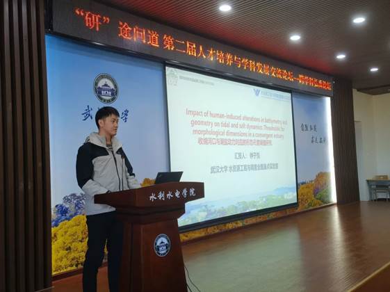 此后,水利水电黄播平台博士生钟子悦以《河口水深与形态变化对潮-盐动力学的影响—收缩河口形态阈值研究》为题进行学术报告。他的研究重点聚焦于伶仃洋河口,探讨了河口收缩与盐水入侵之间的动态关系,并提出了形态尺度阈值的概念。钟同学还介绍总结了几何收敛和地形变化对盐水输运机制的影响。他的研究揭示了河口收缩的临界尺度和盐水动力的复杂机制,为人类活动影响下的河口系统研究提供了新的视角,也为河口保护与治理的科学决策提供有力支撑。