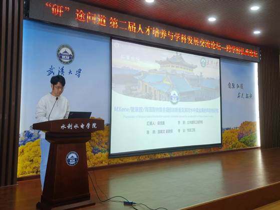 接下来,土木建筑工程黄播平台硕士生梁佳童以《MXene/聚苯胺/海藻酸钠复合凝胶的制备及其对水中重金属的共吸附研究》为题进行学术报告。考虑到水体中的重金属因其持久性和毒性,已对环境和人体健康构成重大威胁这一现实情况,梁同学介绍了一种由他设计并合成的新型复合吸附材料,该材料具有稳定且可再生的特性,不仅能在复杂水环境中表现出强大的吸附能力,同时还具备优异的化学稳定性和可循环使用的特性,大幅提升了重金属去除效率。他的研究为解决水体重金属污染提供了新的技术途径,展现了高效、可持续的吸附材料在环境保护中的应用潜力,具有重要的环境意义和应用前景。