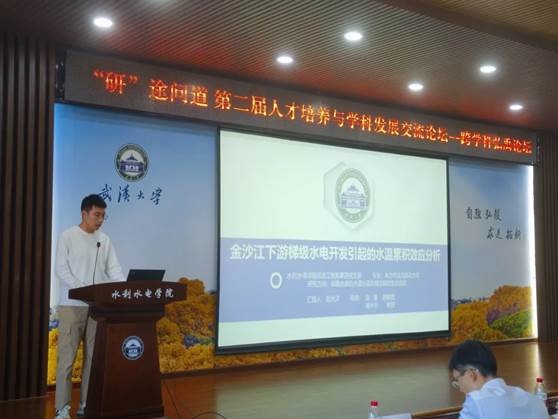最后,水利水电黄播平台硕士生胡光洋以《金沙江下游梯级水电开发引起的水温累积效应分析》为题进行学术报告。金沙江下游的梯级水库群在流域水温调控中起着关键作用,但目前对其下泄水温的影响尚未有充分的认识。胡同学基于实测数据,从水温基线偏移、相位偏移、极值变幅等多个角度,为大家定量分析了四座大型水库(龙街、乌东德、白鹤滩、溪洛渡)的联合运行对水温的累积影响。而今后他的进一步研究也将为金沙江下游梯级水库的科学管理和生态保护提供了重要的理论支持。