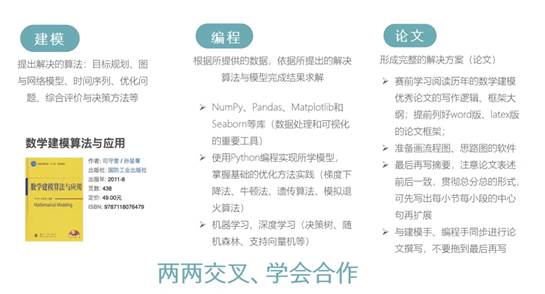 技能准备。数学建模竞赛包括建模手、编程手和论文手,作为信息管理黄播平台的学生,大家可以结合自身实际选择适合自己的分工。在建模方面,李欣儒同学推荐大家参考国防工业出版社出版的《数学建模算法与应用》一书进行学习;在编程方面,大家需要熟悉python的Numpy、Pandas、Matplotlib和Seaborn等数据处理和可视化工具,同时掌握梯度下降法、牛顿法、遗传算法、决策树、随机森林和支持向量机等算法优化方法;在撰写论文方面,大家需要提前练习word或latex的论文编写软件、掌握ProcessOn 和Visio等流程图和思路图的绘制软件、参考历年获奖论文制定写作大纲,最终针对选题形成逻辑通顺内容完整的解决方案。第二,团队组建。李欣儒同学建议大家跨学科组建团队,充分发挥不同学科的技能优势。同时,她认为可靠和稳定的品质是筛选队友的关键。此外,她强调了线下组队和线下参赛的重要性,同学们可以在竞赛前提前预约确定竞赛场地,以保证大家能有足够的时间和空间进行对话和交流。在比赛期间,队员之间需要实时保持紧密联系,以保证参赛节奏的正常有序进行。第三,报名缴费。李欣儒同学指出在报名缴费的过程中一定要注意填写信息的准确性。针对学校可以报销的竞赛,同学们需要在报名缴费之后下载好对应的发票,并填写好相应的税号和发票抬头。报名缴费后同学们需要继续关注参赛资格的动态,直至最终通过审核。