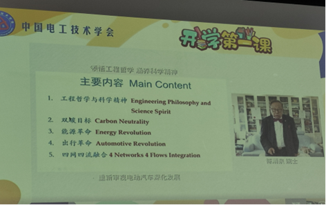 接着,清华大学郭庆来教授以电力系统为主题展开发言。我国电力工业已经创造了多个“第一”:最大的水电站、最大的抽水蓄能电站、最高的交流输电电压等级……郭庆来教授鼓励同学们在未来的电力系统中创造更多“第一”,助力实现双碳目标,把握潮流,发展新型电力能源。