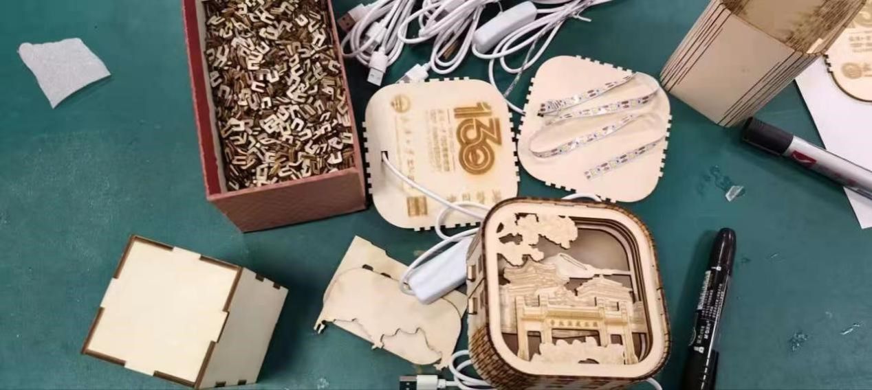 此外,同学们其他各种各样的奇思妙想也在激光下变为了现实。除了一个个精美靓丽的小夜灯外,笔筒、书签也成为了同学们手中独具匠心的作品。