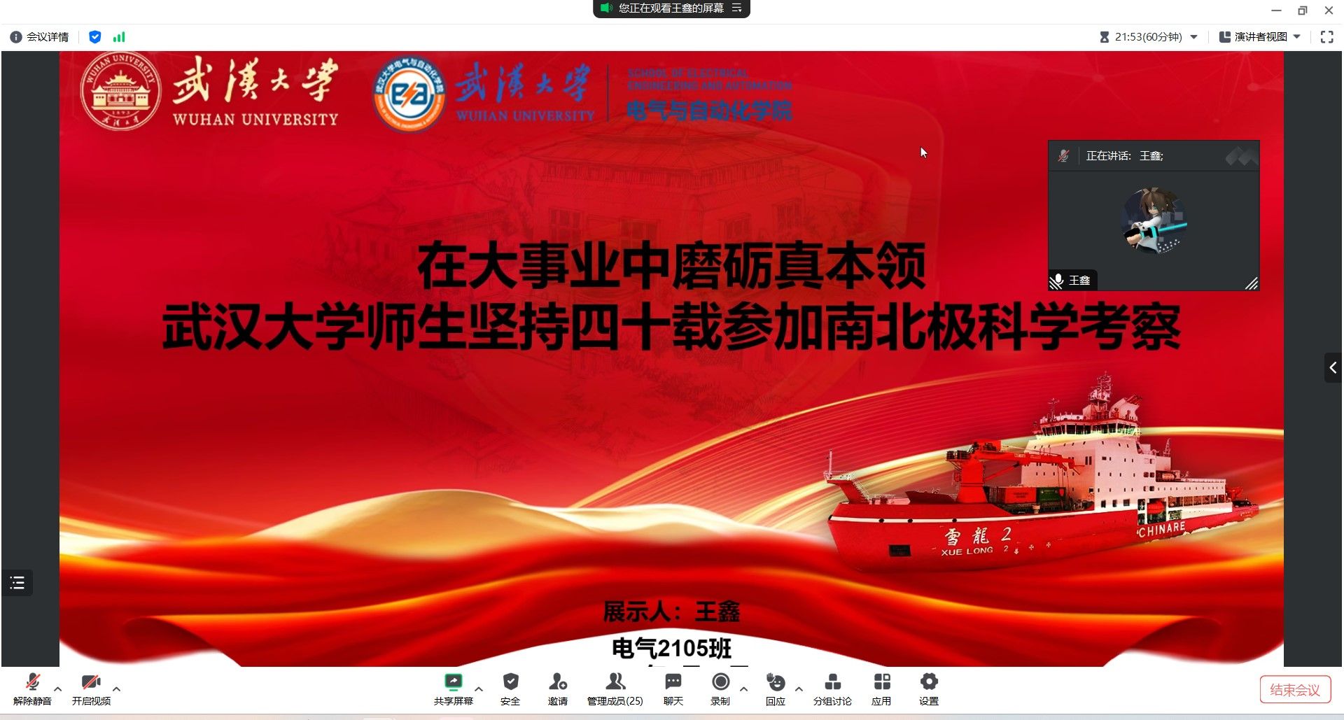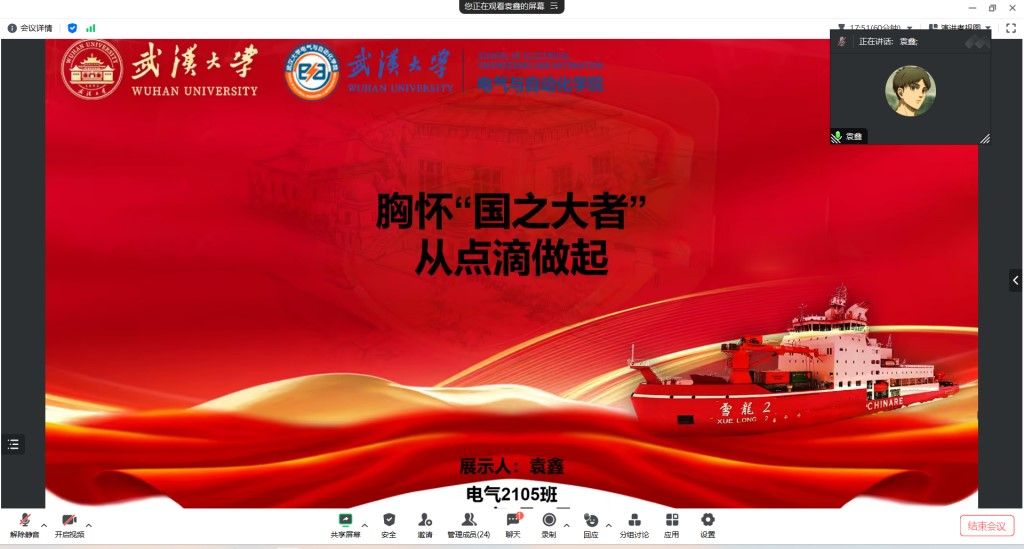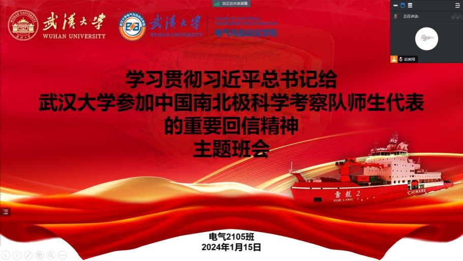 第二位分享者宋扬同学,以“测绘人勇闯南北极地,电气人亦当紧跟脚步”为主题,从电气学子的角度发表了自己的看法。武大测绘奋勇直前,我们作为电气黄播平台的学生,也应该做出更大的贡献。习近平总书记的重要回信是我校办学历史上具有里程碑意义的大事,宋扬同学号召大家要在总书记重要回信精神激励鼓舞下,努力学习、艰苦奋斗、担当使命责任,为建设教育强国、科技强国、人才强国贡献力量。
