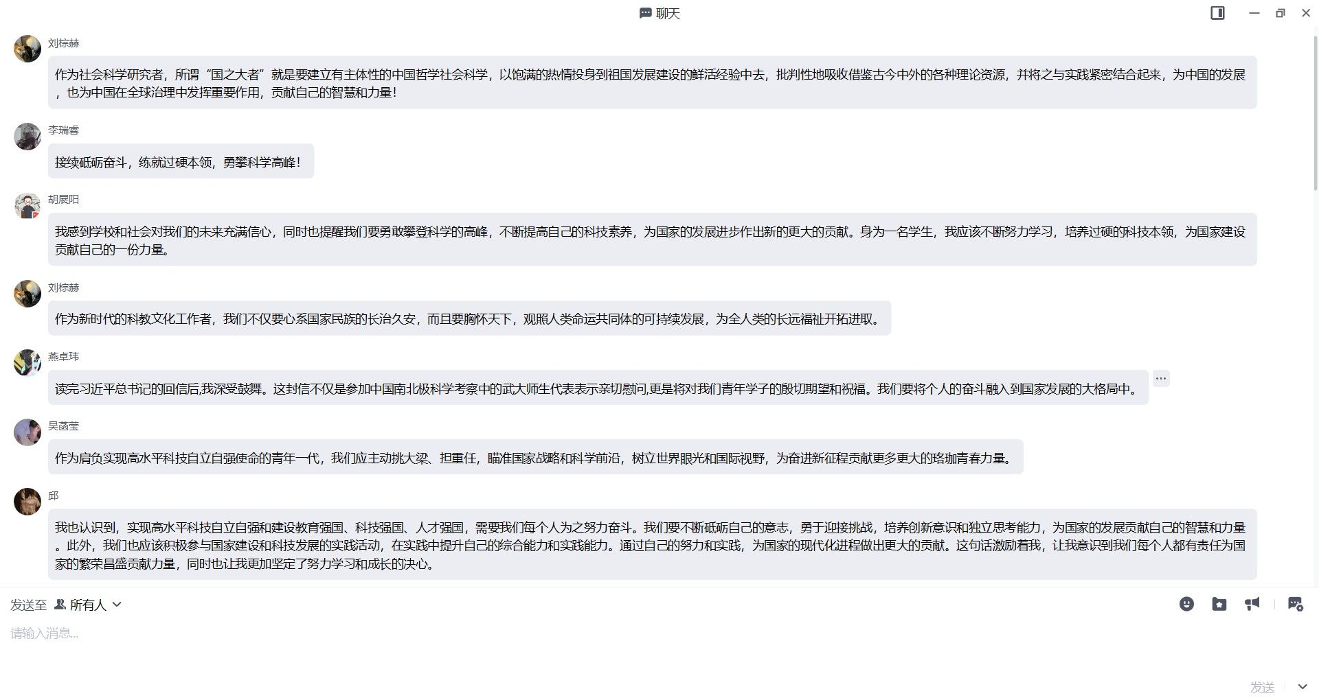 参加中国南北极科学考察队师生代表的回信中强调“希望学校广大师生始终胸怀‘国之大者’,接续砥砺奋斗,练就过硬本领,勇攀科学高峰”,这让武大学子备受鼓舞,更激励着我们青年踔厉奋发、勇毅前行,以实际行动服务国家重大战略需求。袁鑫同学号召大家在往后的学习中,应当全面贯彻习近平总书记重要回信精神,密切联系实际,主动深入实践,时刻胸怀“国之大者”,将国家事业与自身学业紧密相连,作出更大的贡献,建设更强的国家。