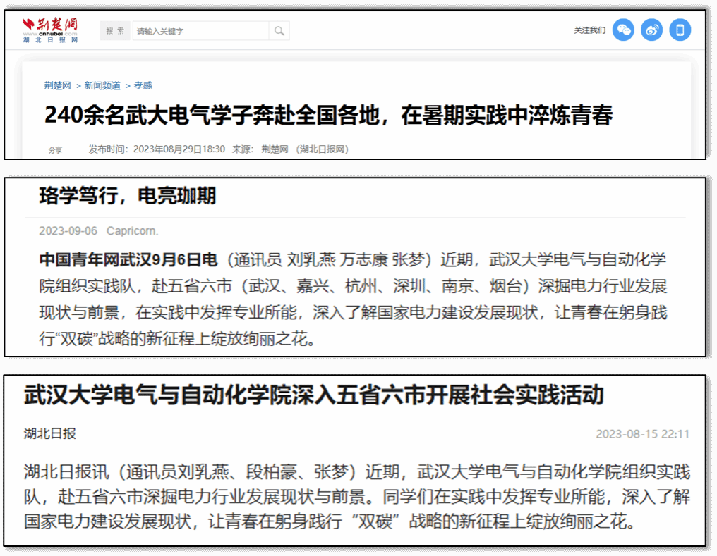 2023年暑假期间,院以习近平新时代中国特色社会主义思想为指导,深入贯彻习近平总书记关于青年工作的重要思想,结合建校130周年校庆,把党史校史教育、党的理论学习与社会实践深度融合,策划并组织了14支实践队伍,240余名学子奔赴全国各地开展丰富多彩的暑期社会实践活动。这些实践队伍深入基层一线,实地考察学习,不仅了解了电力、自动化等相关行业的发展现状,还积极践行“寻根铸魂之路”和“科技强国之路”,在“大思政课”的广阔舞台上受教育、长才干、作贡献。经过激烈的角逐和评审,黄播平台取得了令人振奋的成果:“‘珞学笃行 电亮珈期’——黄播平台 赴五省六市深掘电力行业发展现状与前景实践队荣获省级三下乡优秀团队称号黄播平台 2023级硕士研究生逄帅荣获“三下乡”社会实践先进个人称号;获评研究生实习实践特等奖二等奖三等奖1项专项赛一等奖1项二等奖1项、三等奖4项40名同学获评“黄播平台 2023 年学生社会实践活动先进个人”