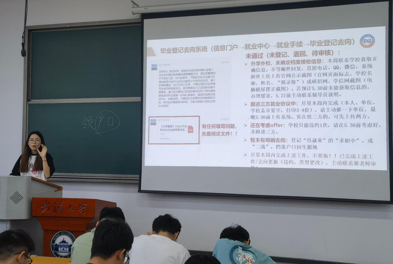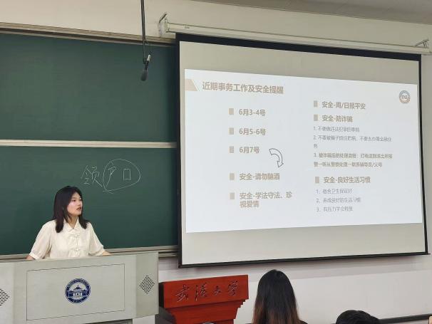 本科2021级三位兼职辅导员刘乳燕、梁美欣、张浩杰老师分别围绕毕业季近期重点工作安排、就业系统填报、档案去向登记、政审表填写、第二课堂学分审核等内容进行分享。其中,在日常管理上,要求同学们继续坚持日报平安工作,并重点强调了离校前的安全注意事项,包括防范电信诈骗、杜绝酗酒滋事、遵守法律法规等。