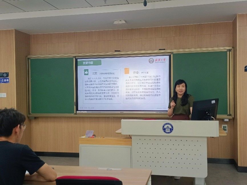 接着,上官海兰老师基于对党的二十大报告和总书记在中共中央政治局第五次集体学习时的重要讲话的学习,对教育事业已经取得的成绩和未来的发展方向,从“中国教育发展取得的成就”、“对于未来教育发展的定位”、“办人民满意的教育”、“通过教育现代化促进中国式现代化目标的实现”四个方面交流分享了学习体会,指出要将马克思主义与中国实践、中华优秀传统文化相结合,以人为本,把人的全面发展视为根本目标。