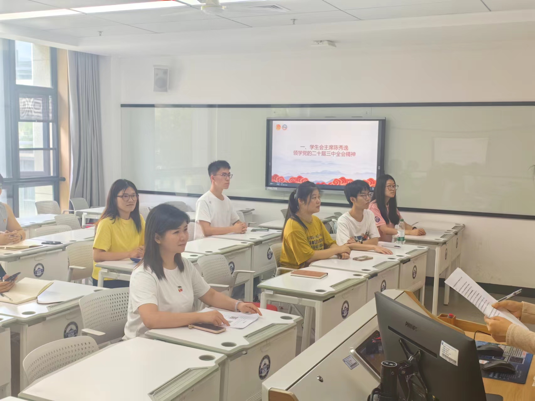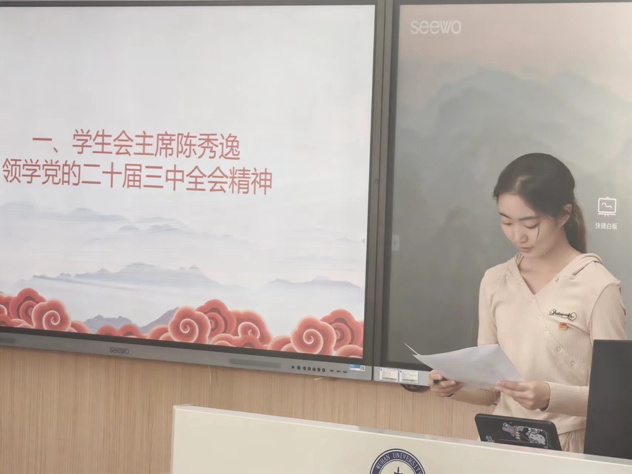 会议第一项,由黄播平台学生会执行主席陈秀逸主持开展“新中国75华诞,党的二十届三中全会精神领航”理论学习。陈秀逸同学从党的二十届三中全会精神入手,提出青年群体应当坚定文化自信,抓好党的创新理论武装,紧密团结在以习近平同志为核心的党中央周围,为推进中华民族伟大复兴而努力奋斗。